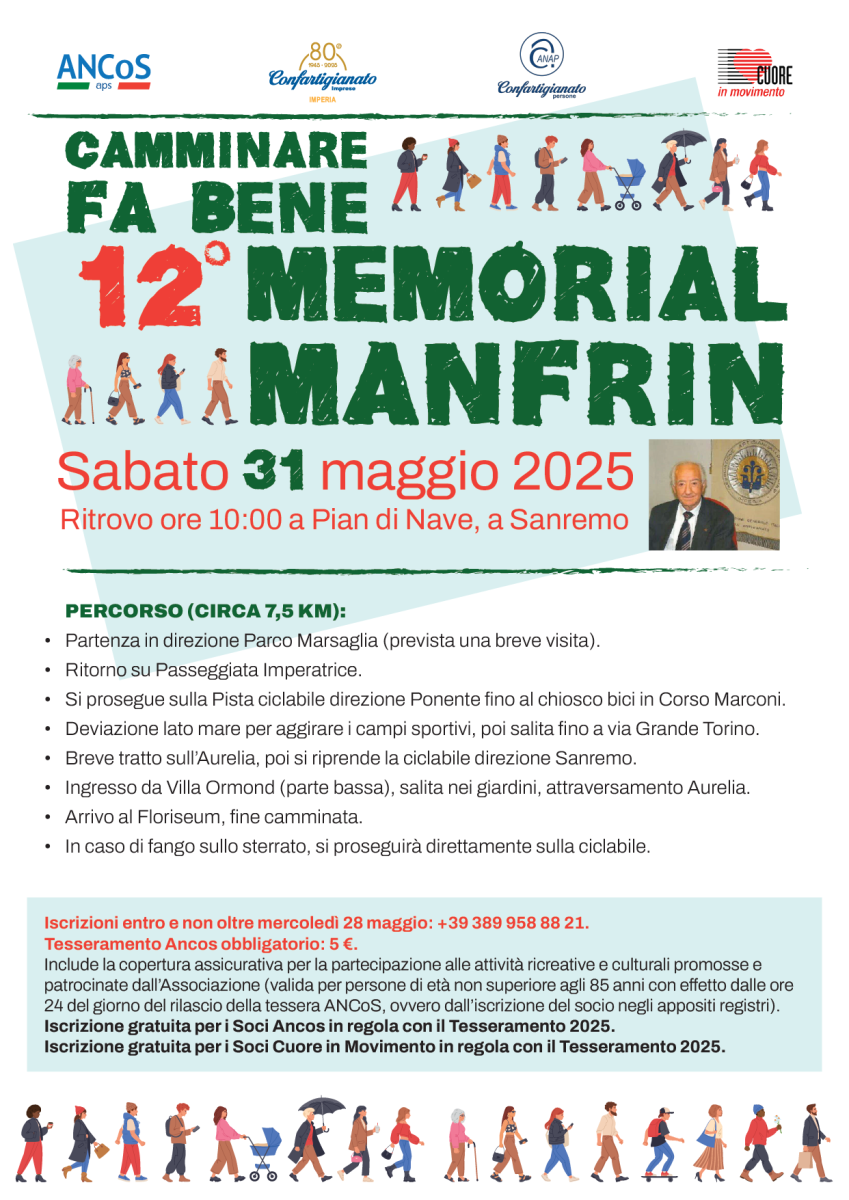 Torna anche quest’anno a Sanremo il tradizionale appuntamento con “Camminare fa Bene – Memorial Clemente Manfrin”, giunto alla 12ª edizione. L’iniziativa, promossa da ANAP Confartigianato Imperia in collaborazione con l’associazione Cuore in Movimento, si svolgerà sabato 31 maggio 2025 con partenza alle ore 10:00 da Pian di Nave (Santa Tecla).