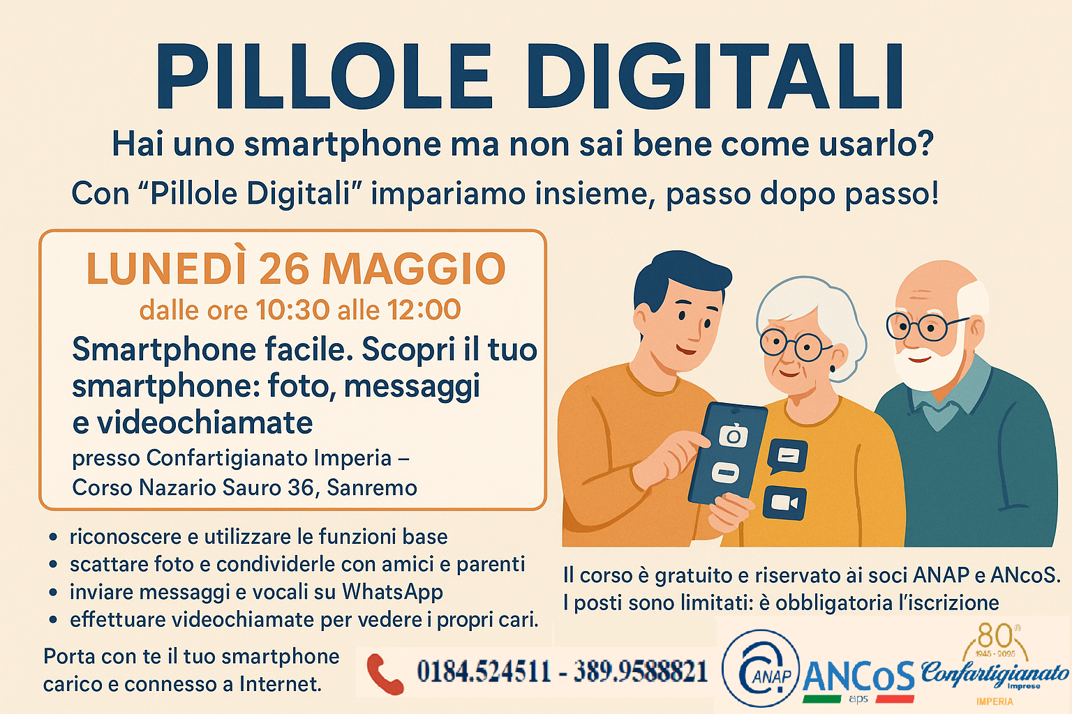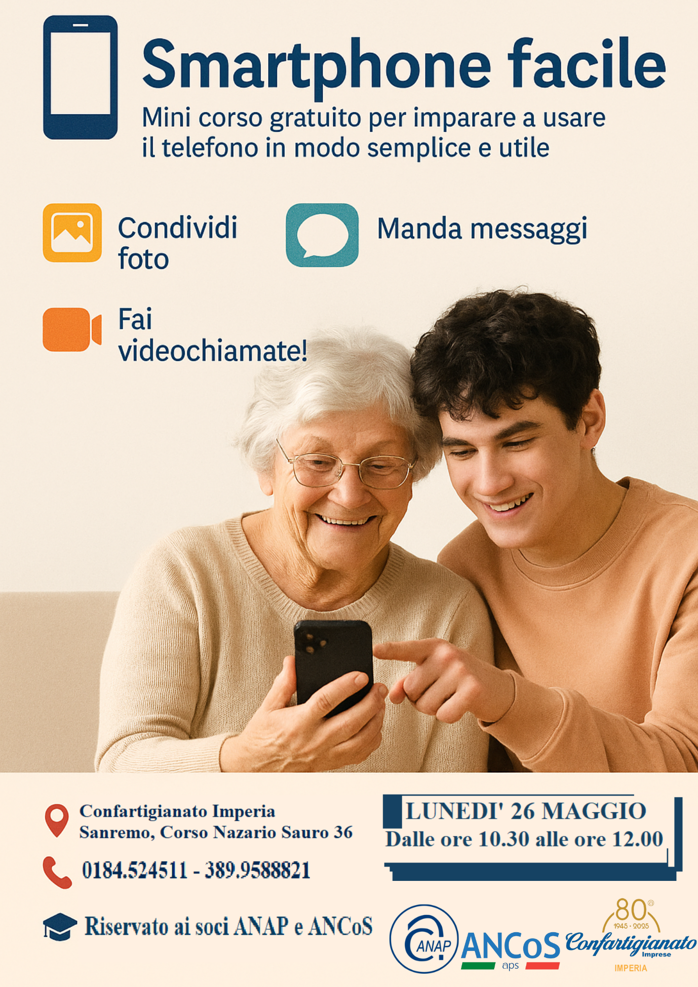 Confartigianato Imperia, in collaborazione con ANAP e ANCoS, organizza un mini corso gratuito riservato ai soci, pensato per aiutarti a usare il tuo smartphone in modo semplice e utile nella vita di tutti i giorni.