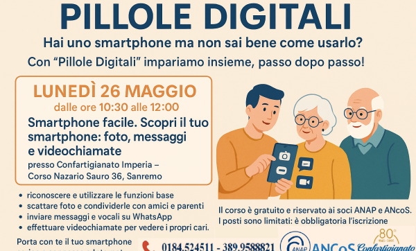 Si è svolto con successo questa mattina, lunedì 26 maggio, il primo incontro del mini corso gratuito “Pillole Digitali”, promosso da Confartigianato Imperia in collaborazione con ANAP e ANCoS, e riservato ai soci.