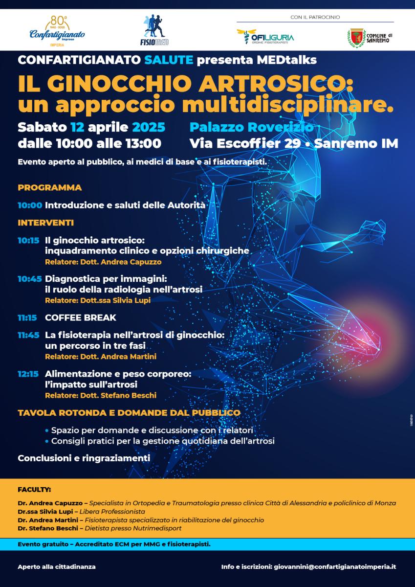 Dopo il primo evento, svoltosi ad aprile 2024 sul tema “La prevenzione nella gestione del dolore”, e il secondo incontro di dicembre 2024 dedicato alla spalla dolorosa, il nuovo appuntamento sarà focalizzato su “Il ginocchio artrosico: un approccio multidisciplinare”, in programma sabato 12 aprile 2025, dalle 10 alle 13, presso Palazzo Roverizio – Via Escoffier 29, Sanremo.